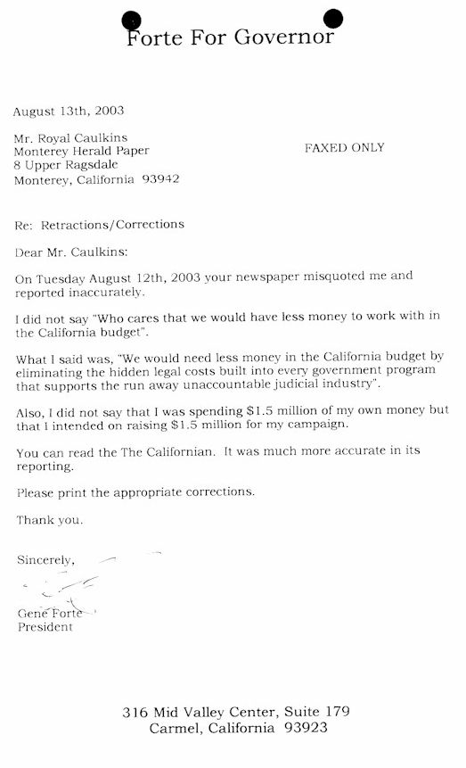 Contact Us: Forte For Governor 316 Mid Valley Ctr., #179 Carmel, CA 93923 Tel: (831) 484-7516 Fax: (831) 484-7553 Subscribe To Our Email List Help Spread The Message September 22, 2003 Last Day To Register Election and Voter Information For Monterey County: Download Absentee Voter Application Register To Vote Information On Absentee Ballots